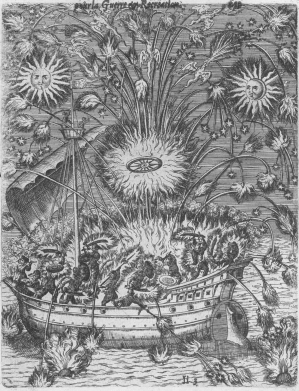 Last week’s post finished with this image of a firework display on a ship. It was part of an artificial battle scene designed by Jean Appier Hanzelet, Firework Master of the Duke of Lorraine. The sky is filled with suns, stars, rockets and small fire-breathing dragons. Like the ships crew who appear to be exploding they are all artificial and made in Hanzelet’s workshop. Such artifice was soon to become well known across northern and Western Europe and filled palace gardens and grounds as well as public spaces on grand occasions.
