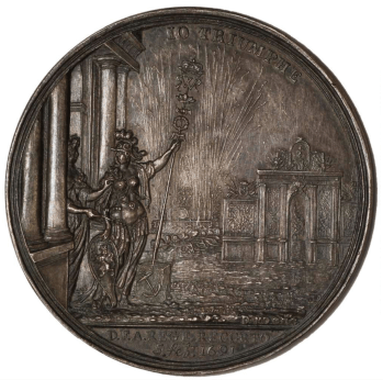 Medals were struck when he returned to The Hague, in 1691 following his victory over James in Ireland at the Battle of the Boyne. Triumphal arches and immense festivities as well the fireworks were laid on to outshine their great enemy Louis XIV who had organised grand celebrations illuminations and fireworks when it was mistakenly reported that William had been defeated and killed.