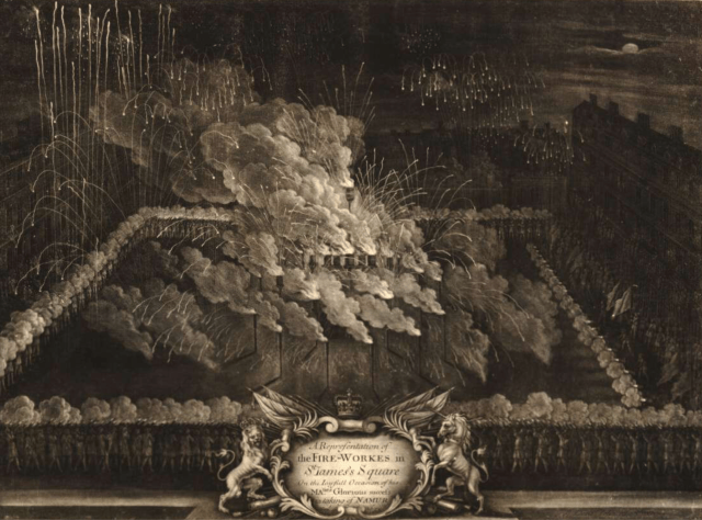 Charles Hatton, younger brother of Viscount Hatton of Kirby, went “to see ye fireworkes, for wch there had been soe long and costly preparations. I was very desirous to see ym, but, not knowing whither conveniently to goe, I had given over all thoughts of seeing them, and my curiosity was quite abated; but ye day they were to be I had 3 or 4 tickets sent me, and by my wifes earnest persuasion I went; but my curiosity was as little satisfyed as any person’s ther. It is generally reported ye expence for them amounted to £12000. Ther was in St James’s Square a sort of triumphall arch built, but very ill designed, on ye topp of wch were 4 figures made of wood and painted, one at each comer, and, had ther not been ye names of what they were designed for, noe person cou’d have guess’d what they were meant for. Peace out of a comucopeia flung out rockets of wild fire. Conduct had a death’s head in one of her hands. Concord held in a dish a flaming heart; and Valour had by it a ravenous lyon. The whole was an emblem. Ther was a great unnecessary expence of treasure; severall killed; a vast number of crackers; and all ended in smoake and stinke. Sir Martin Beckman hath got ye curses of a great many, ye praises of noebody. Ther was only a vast number of chambers shot of, and a prodigious number of serpents and large rockets, the cases and sticks of wch were soe large that, when they fell down, killed assuredly 3 or 4 persons, hurted many more. One falling upon ye Lord Hallifaxes his house broke quite thro ye roofe, but hurt noebody.”