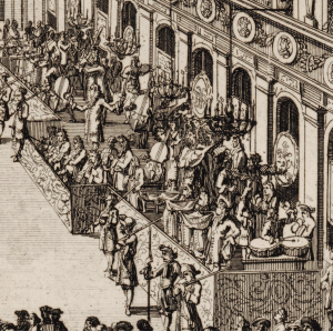 There are however plenty of continental sources, and if the number of images and events recorded it was France who led the way. This drawing shows a display in the grounds of the Palais Royal in Paris in 1642 in front of Louis XIII and his wife Anne of Austria. It gives a clear indication of the way such events were laid out, organised and policed.