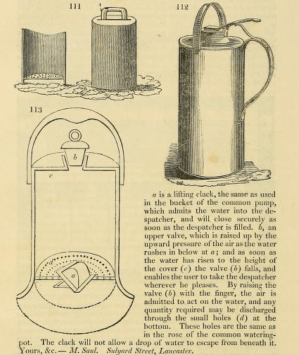 It’s in 1831 as well that his tree planting machine [a variation on those of Sir Henry Stuaurt that I’ve written about earlier] was published. Next was an account of Saul’s Water Dispatcher: a modified watering can, which he boasts is superior in several respects to two other modified watering can recently featured by Loudon.