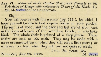 In 1833 Loudon received another present from Lancaster. This time not a plant or a tool but a chair of Saul’s own devising. For once it didn’t go down too well with Loudon who didn’t like the design as it wasn’t realistic enough.