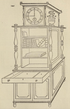 Loudon was however much more impressed by Saul’s 7 ft high combined bookcase, writing desk and clock and gave it prominent coverage in his Encyclopaedia suggesting that 10,000 ought to be made.