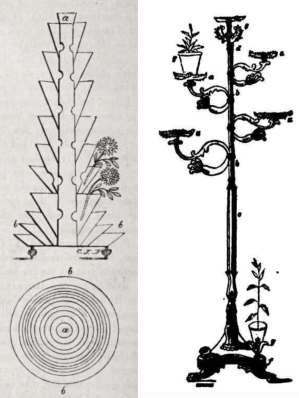 And lets not forget his “fountain flower pots” and his flower pot with hollow sides – a premonition of today’s self watering pots- and a whole array of plant stands. These included ones with revolving and removable arms, and one [sadly not illustrated anywhere] in “cast iron, [which] represents a male figure attired in the exact costume of the Swiss guards, as worn in the 16th century, all painted in proper colours, and bearing in each hand a basin for the reception of flower pots or bouquets.”