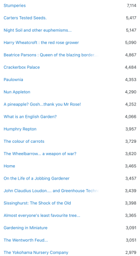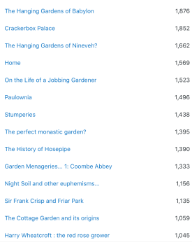 As you can see from the table on the right most of the other more popular pieces were “old favourites” including those about Frank Crisp’s Crackerbox Palace at Friar Park, and Stumperies. That principle held true for the all time number of views as well . Stumperies has continued to prove really popular, as have those on Carters, Harry Wheatcroft and Beatrice Parsons.