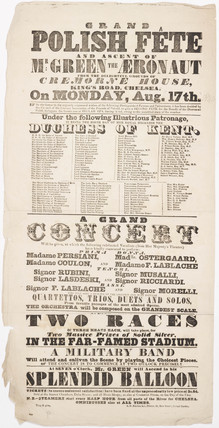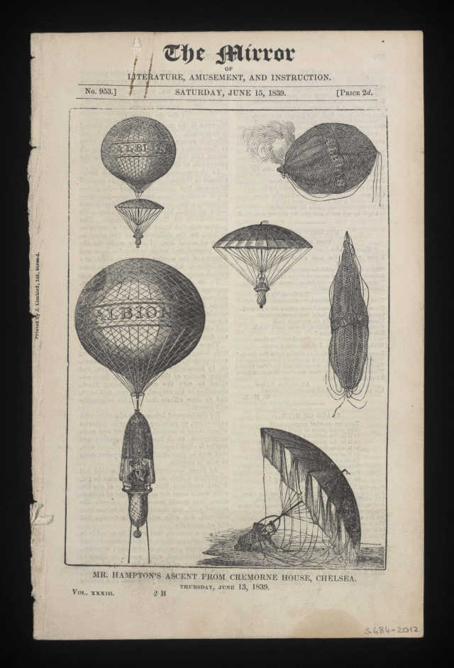 Many of these flights were undertaken by Charles Green the leading “Argonaut” of the day. Newspapers often carried reports detailing the path the balloon took, where it set down – often way outside the city – and how the aeronauts were regaled with refreshments before travelling back to Chelsea.