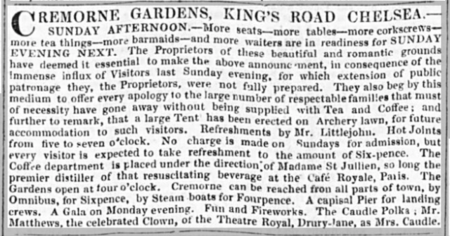 The gardens and its attractions once again became very popular but Ellis was “led by the great influx of visitors to an outlay… that was far too lavish and beyond his means.”and he went bankrupt in 1849 after four years of running Cremorne, with others having a financial stake in the proceedings. His improvements cost about £8000 but he ended up in debt to the tune of more than £16,000. It didn’t help that he was also trying to run a casino [a new thing in London] and providing catering at several other major venues in London. If you’re interested in the financing of the garden then look at the detailed Morning Post’s coverage of Ellis’s bankruptcy.