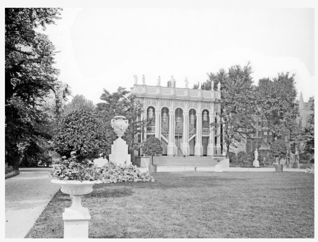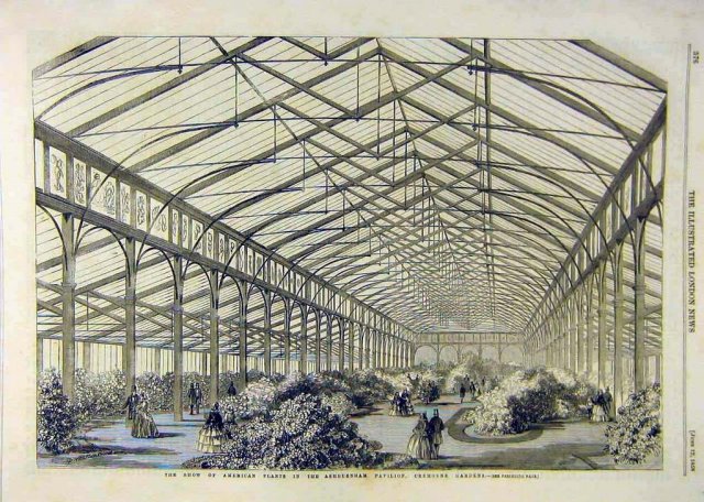 Simpson managed to acquire the lease of the neighbouring property, Ashburnham House in 1850 and a huge hall was constructed along the former boundary between it and Cremorne. This was used as a venue for exhibitions of all kinds including those of nurserymen like Waterers but also dog shows, flower shows, and grand dinners.