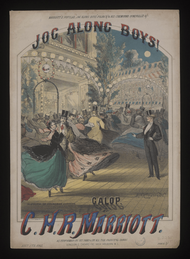 Later in 1866 an amphitheatre was erected behind the Ashburnham pavilion for gymnastic and equestrian performance, but also ballet which all “gave a new tone” to Cremorne [Times 4/6/1866].