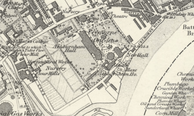 The earliest Ordnance Survey maps of this bit of London don’t appear until quite late and show the area was being rapidly urbanised. Although there were still nursery grounds to the west, the south bank of the Thames opposite was being covered with industrial buildings and housing was creeping up from the west.