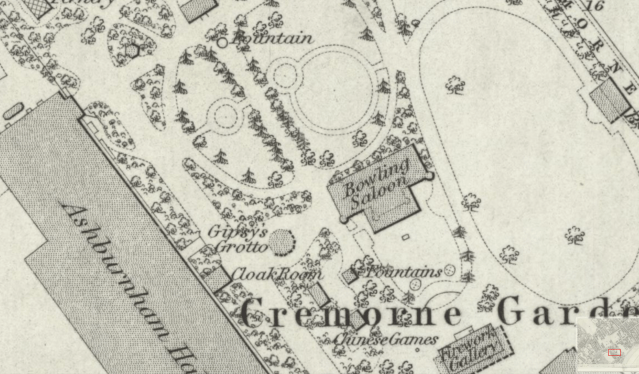 Apart from these major venues the gardens were dotted with stalls, kiosks and side shows and parts of it must have resembled a fairground, but, the underlying structure of the original gardens of Chelsea Farm and Cremorne House remained recognisable, notably some specimens trees and what Warwick Wroth called “the encircling fringe of ancient trees.”