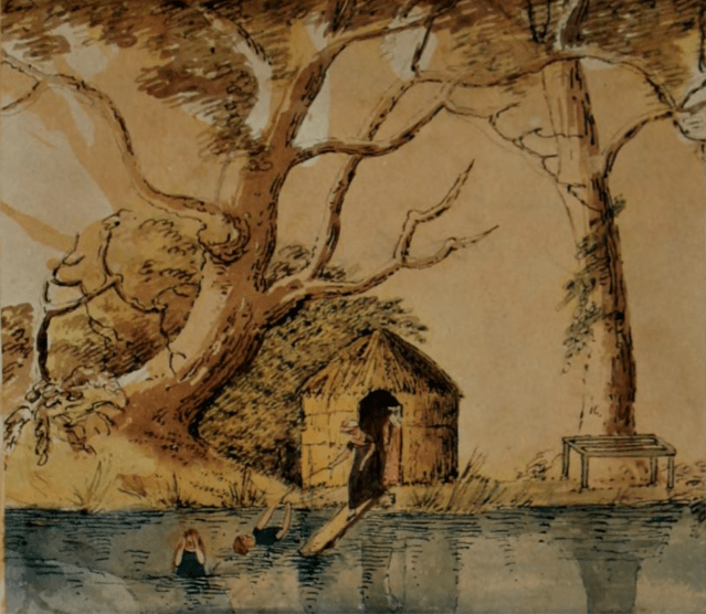 The lake features in several sketches. There was a tiny rustic building on the bank, which has been suggested might have been a boathouse, although its would only have been big enough for something like a rowing boat. Its certainly is a far cry from the sort of boathouses seen on grander estates. Boating had become a very popular pastime and as Kate Felus points out in The Secret Life of the Georgian Garden boats were often built at the same time the ornamental waters were being dug or dammed. However at Dynes there are no signs of any boats and the paintings show it rather being used as a base for bathing, fishing and ice skating in the winter.