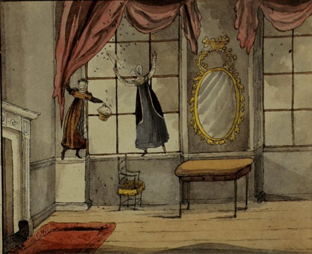 There is a charming view of 3 women putting up wallpaper and another of Di’s mother “murdering” flies with a servant on hand to pick up “the dead and wounded.”