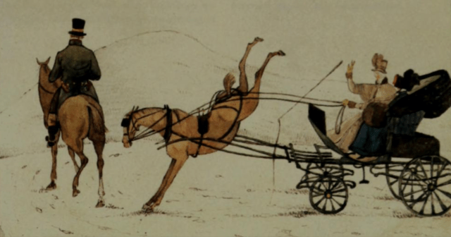 The same problems applied on the larger roads that linked towns and villages. From the mid-18thc there were massive improvements in road transport with the introduction of turnpikes. This took the responsibility for road maintenance off the local community and and gave it to bodies of local trustees who could levy tolls on users. These turnpike trusts remained responsible for most English trunk roads until the 1870s. One of the main roads near Tickford clearly hadn’t been “improved” and there is a sketch of the chaos caused when the coach got stuck, with luggage and dogs being thrown down to lighten the load. Arthur Young the agricultural writer who spent much of his life touring the country noted of the main road between Newport Pagnell and Bedford [very close to Tickford] that it was “a cursed string of hills and holes by the name of the road.”