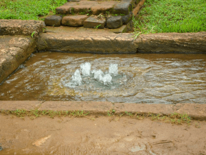At Sigiriya there is a vast tank near the site which stands on slightly higher ground than the gardens and so it can supply water under gravitational pressure, and it’s this part of the system that has been restored to provide much of the water for the ponds and fountains. Additional water comes from a series of smaller ponds cut into the plateau on top of the rock of the rock, which is collected during the monsoons and the overflow collected in underground cisterns where it cannot evaporate in the heat, before being channelled into the gardens as and when required. According to the site’s director of archaeology. The whole system ” involves the knitting together of a number of hydraulic structures of varied scale and character in a single intricate network – a complex masterpiece of irrigation engineering design,”