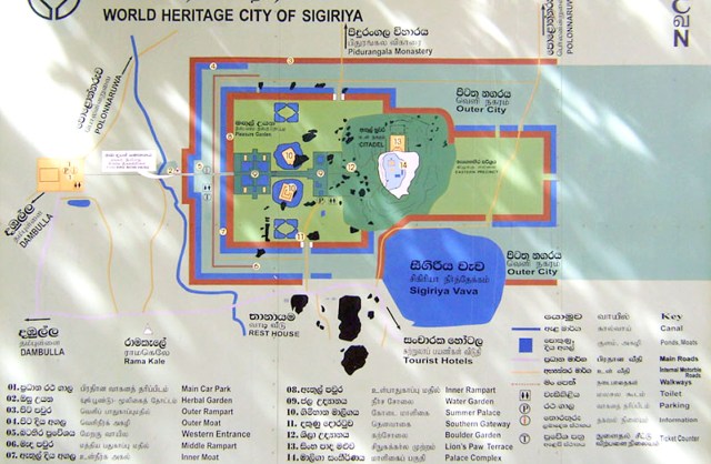 The plan shows the central rock surrounded a roughly elliptical walled inner precinct, [white and pale blue on the plan] and then outside that two further large precincts on the east and on the west side -surrounded by high earth ramparts and a wide moat. Finally encompassing the whole site is another rectangular enclosure again with a moat and ramparts. The whole site is aligned on a single east-west axis. Just outside were a large reservoir [Sigirita vava on the map]and the town.