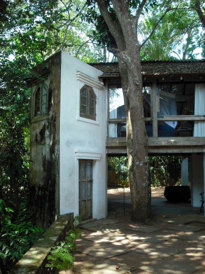 The first building one passes used to be his workspace with his table carefully positioned so he could look out over the gardens sweeping down towards the lake. It’s a double height building with clerestory windows, and looks gently weathered despite being only built in 1983. That’s because the doors and windows, in genuinely distressed colours, had been save and recycled from old houses in Colombo that were due for demolition.