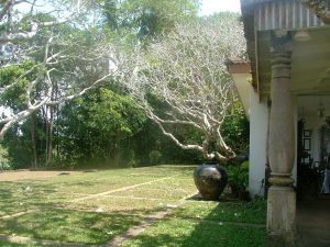 Frangipani are one of my favourite trees, and probably the one I most envy gardeners in warmer climes. I’d guess from the number of them they must have been one of Bawa’s favourites too. Unusually for a sub-tropical tree they are deciduous and their strongly scented waxy blossoms appear on on bare stems. As they age they form a complex system of branches which can be exaggerated, as Bawa did by weighing down some to force them into even more splayed shapes. Normally multi-stemmed rather than single trunked they make for an odd but strangely effective choice for an avenue.