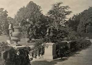 Country Life in 1900 argued that “a perfect unity of character exists between the house and the garden. The terrace is extremely rich and beautiful, and it is supremely delightful to look thence over the lawns, to note the beautiful trees and feel the fragrance of the flowers. There are beautiful urns of bronze upon highly wrought pedestals. Upon the south lawn sheltered by the long, overhanging limbs of noble cedars of Lebanon, or strewn with the blossoms of the venerable limes, are disposed large vases of various forms and rich materials.”