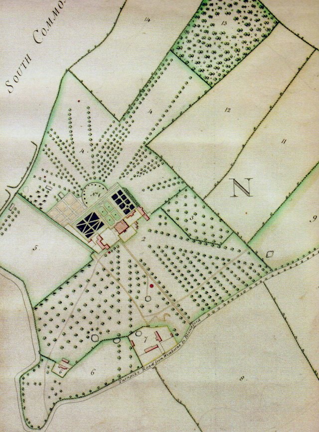A large scale survey was carried out by William Woodward in 1773-5 before the enclosure of much of the surrounding land. It shows the formal gardens, with a walled parterre probably comprising gravel paths and a statue in each quarter. There were gardens on either side of this, a walled exedra with statues or urns and a walled entrance court. Lots of avenues are shown, one of which in lime still survives. The grounds were then remodelled in the 1770s and 1780s, with the formal gardens and avenues apart from the lime avenue swept away. The parkland was enclosed, new service buildings put up, the main road diverted, new drives and approach roads laid out and the entire village of Kingston demolished in the process.