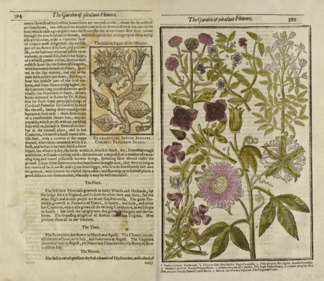 Passiflora caerulea was growing in Paris by 1625 and in London by the time John Parkinson published Paradisus in 1629. It’s also clear by then that the Italian image and Easter-related symbolism was widely known,  because Parkinson actually includes a version of the print alongside the main plate showing the passion flower. He adds that “some superstitious Jesuite would faine make men believe, that in the flower of this plant are to be seen all the marks of our Savious Passion: and therefore call it Flos Passionis: and to that end have caused figures to be drawne and printed with all the parts proportioned out, as thorne, nailes, speare, whippe, pillar etc in it” before adding scornfully  “and all as true as the Sea burnes… God never willed his Priests to instruct his people with lyes: for they come from the Divell, the author of them.”