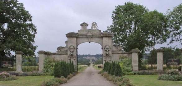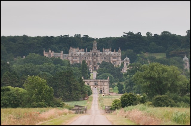 There is a relatively modest [compared with what is to come!] entry arch on the main road that opens onto a mile-long straight drive. The house looms ever larger as the road leads across a bridge, under a gatehouse that straddles the road, past the massive walled kitchen garden before arriving at the entry screen of the court of honour and the towering face of the manor house itself.