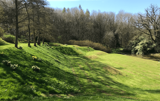 These terraces descend to a formal rectangular “Dutch” canal, and from the surviving landform may well have had a cascade running through the centre
