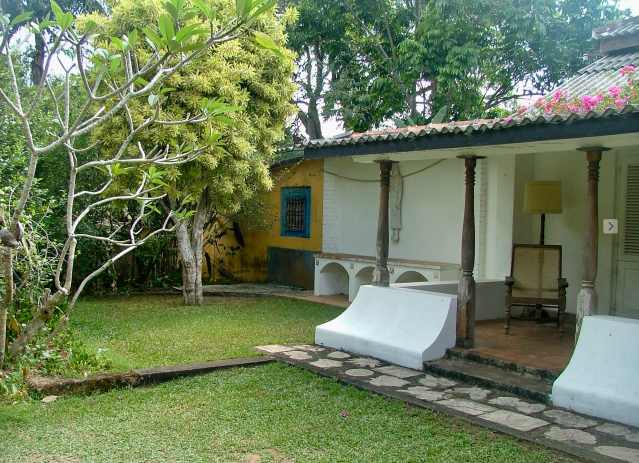 The approach to this “climax of loveliness” is unexciting – along the narrow road that Bawa had built through a landscape of paddy fieldd, small hills and through spreading housing and some stands of jungle. These days the road ends at a small tree-lined turning circle.