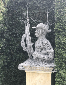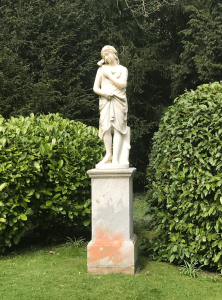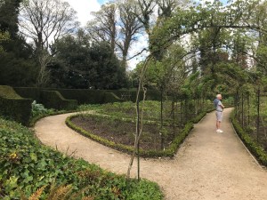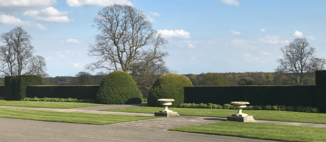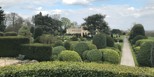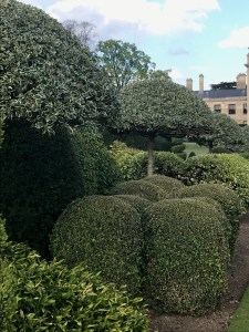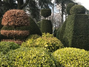 All the trees and shrubs are meticulously clipped and shaped, and the effect is rather like a box of children’s bricks painted in various shades of green, laid out randomly but tightly packed around a series of statues and two giant cedar trees. A single path runs from the western end of the house through the centre of the planting to the gardens beyond.
