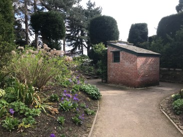 However one estate building is accessible. It lies in the opposite direction in the middle of the informal shrubbery, beyond the rose dell, and was the garden privy. Its doorway is hidden behind trellis and now surrounded and covered by lovely scented climbers. Its survival is rare, its restoration in 2017 beautifully done and its a good example of how far the idea of interest in history and conservation has come in recent years.