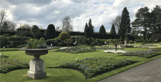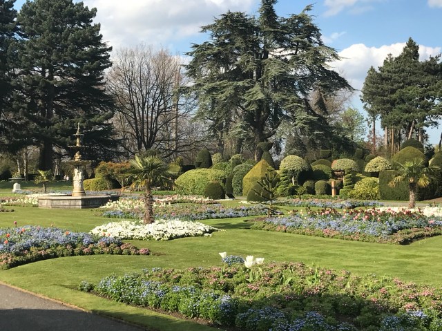 What lies beyond the evergreens has another WOW factor. A huge Victorian parterre filled with carpet bedding and “dot” plants in intricate patterns around an ornate central fountain and four large tazzas or shallow urns.