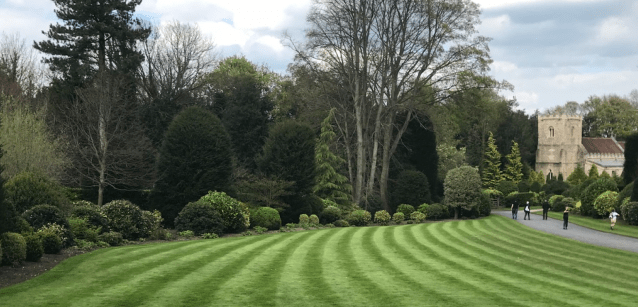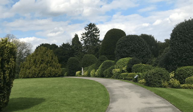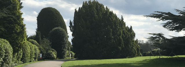 These continue all along the southern boundary of the pleasure grounds next to an immaculately cut yew hedge, an occasional gleaming white statue and elegant iron railings. Glimpses of open parkland planted in the 18thc beyond act as a foil to the geometrical formality of the evergreens.