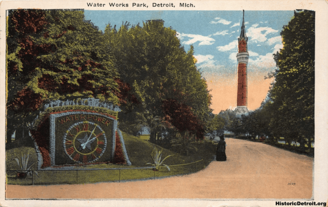 At almost the same time another floral clock was created in Detroit in 1893, not as part of any exhibition or trade fair but as a by-product of a new water supply system. This had opened in 1879 but there was a lot of surplus land and the authorities decided to use them as a public park imaginatively named Water Works Park.