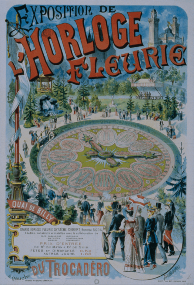 The first real functioning floral clock was created in 1892. It was laid out in a small jardin anglais adjoining the Trocadero Palace on the opposite bank of the Seine to the Eiffel Tower. A commercial attraction, with visitors paying to enter the garden through a turnstile, it was described as like “an immense face scintillating with precious stones”, although of course they were flowers. These were laid out in multicoloured arabesque patterns. The clock was powered by water supplied under a constant pressure from a nearby cascade, which drove the gearing mechanism. Henri de Parville writing in Le Figaro said it was ” un trouvaille!” – a brainwave. He went on to suggest that it would be easy to open gardens at night too, with electric lights among the flowers, and to “throw sparkling diamond dust on the hands to dazzle the spectators”. He suggested installing one everywhere there was a reasonable water supply and definitely wanted wanted one installed at the next great Paris exhibition in 1900.