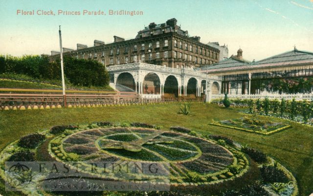 The first working floral clock in England was on Royal Prince’s Parade in Bridlington in Yorkshire. A crowd of several thousand turned up to see the lady mayoress cut the ribbon and start it up in June 1907. The mechanism was electric and also by James Richie of Edinburgh, while the horticultural side was done by the town’s head gardener. It was 12 feet across and used 10,000 plants.