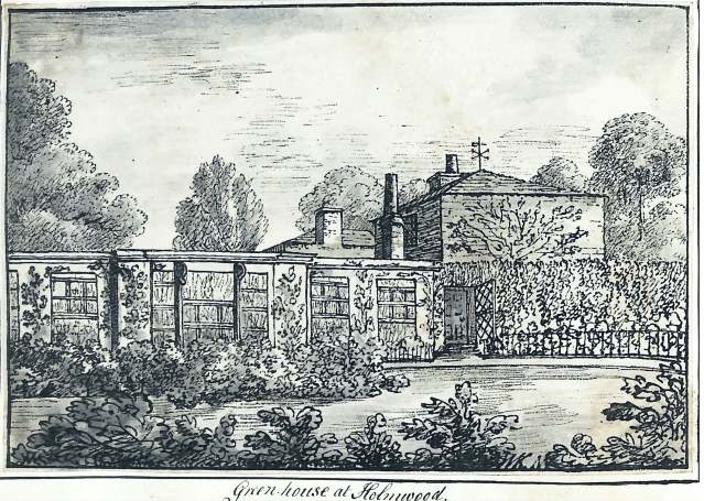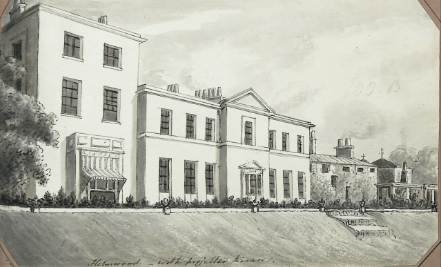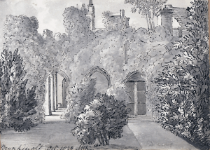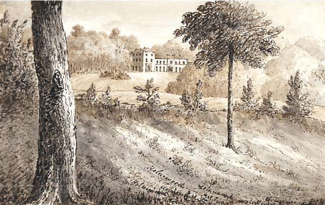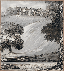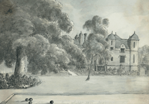 There are a few signs of shrubs close to the house on the south side in the earlier images above but by 1831, as you can see from the image below, things appear much more “garden-like” with island beds and a specimen tree or two, perhaps a little akin to John Claudius Loudon’s “gardenesque” style.