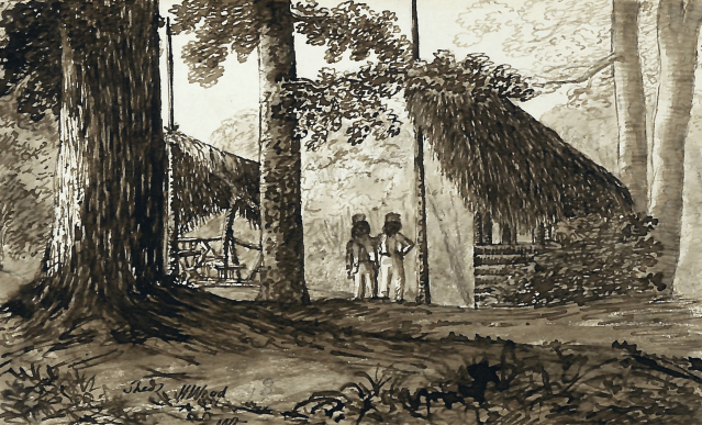 Later both he and Charlotte, who was also a talented amateur, took lessons from William Payne who was the most fashionable drawing-master in London and inventor of a new approach to watercolour painting which is evident in Kerr’s work. Among the innovations with which he is credited included abandoning the use of an initial pen outline which was then filled in, dragging colour with the side of the brush, reinforced by striations (parallel lines), to denote broken ground, and vigorously drawn loops of foliage. The invention by which he is best known is a neutral tint composed of indigo, raw sienna, and lake still called Payne’s grey.