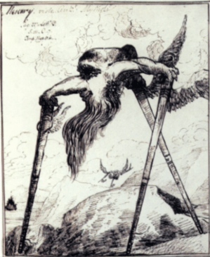 During the brief periods of peace, particularly after the Treaty of Amiens, the couple travelled round their friends country houses and he would entertain his hosts and their children with not just “standard” landscapes but caricatures. He started with a series of drawings of monsters originally inspired by the Gorleston Psalter, then owned by his friend Lord Cornwallis. These were highly original and in the same vein as the work of Blake, Fuseli and later Edward Lear. Unfortunately apart from an album in the Metropolitan Museum in New York these are almost all in private hands and as far as I can see none have been digitised.