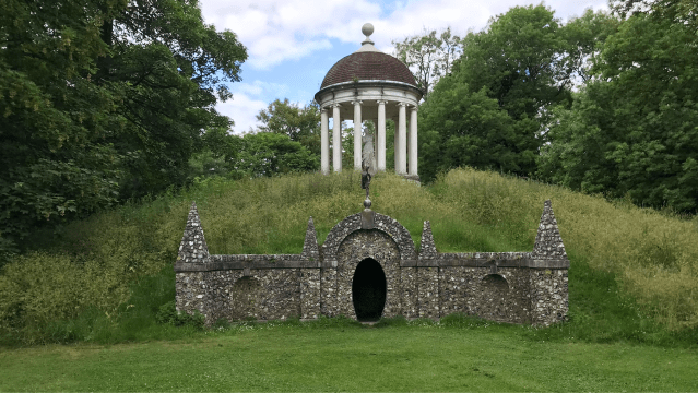 The whole thing clearly shocked Dashwood’s successors and the Temple was demolished, the statuary dispersed and the mound partially levelled before being allowed to get overgrown. The 11th baronet enlisted Quinlan Terry to help recreate it and the new version, housing a copy of the Venus de Milo rather than the Venus de Medici as in Dashwood’s day, went up in 1982.