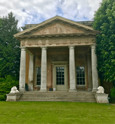 The temple is, like the west portico, based on an early engraving [1755] of its Athenian namesake, by Nicholas Revett and James “Athenian” Stuart. The design was adapted by Donowell, to take advantage of the steep drop from the terrace down to the former main approach drive to the house.