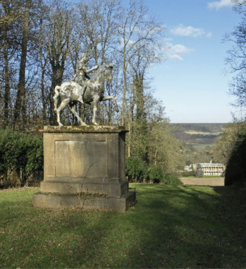 On the summit of a broad ride that cuts through the wood is an equestrian statue. This is not, as one might expect George III or some contemporary great military hero in lead but Imperator Dashwoodus Rex an ex-film prop made of fibreglass and apparently swapped for a case of champagne by the 11th baronet in 1984. He obviously had a great sense of humour!