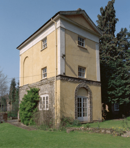 It stands on top of a flint-work arched screen which hides the entrance to an icehouse dug under the terrace. Donowell recycled the door-case of the original mansion which was removed as the alterations of the house got under way. It’s great fun as a structure and commands extensive views, back over the parkland and down what used to be the main entrance drive.