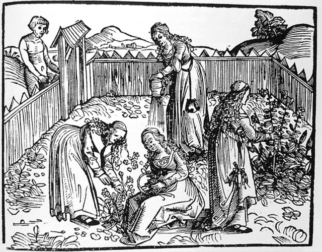 It’s also worth pointing out here that both the chantepleure and pots with perforated spouts were not just for watering your garden or potted plants but also had domestic uses, particularly in laying dust. With floors often made of beaten earth or covered in rushes or straw there was a huge amount of dust and dirt in the air and sprinkling water was the most effective way of keeping that under control. In fact the habit didn’t die out when stone, tile or wooden floors became more common. It was reported that this practice of using watering pots to keep down dust was still in use in well into the mid-19thc in London at least [for examples of that see William Thomas Whitley, Art of England 1821-37]