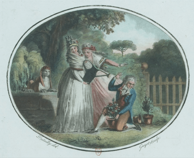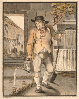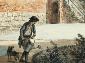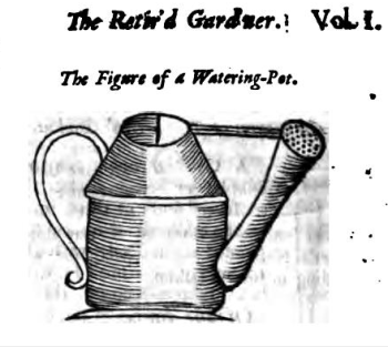 Yet its clear that the more modern-looking metal alternative was also in use as can be seen in The Retir’d Gardner (1706) a translation by George London and Henry Wise of two French books including Francois Le Gentil’s Le Jardinier Solitaire: “Nothing is more useful in a Garden than a Watering-Pot, so that a Gardner cannot be without it. It imitates the Rain falling from the Heavens; when being bended down, it spouts forth Water thro’ a thousand holes, in a sort of Head that’s made to it. By this means, it succours the Plants in the most beneficial manner”