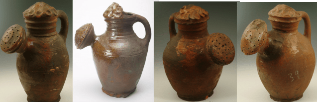 There are a few early paintings showing people watering plants with “ordinary” jugs but we know that pots specially for watering begin to make an appearance in early medieval documents about gardens, which were of course largely utilitarian rather than ornamental. They had presumably evolved to be as efficient as possible given the constraints of material and ease of use.