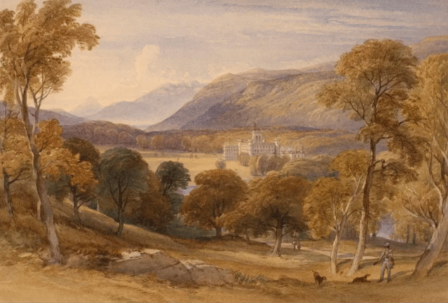 The earl had demolished most of the former castle and had it rebuilt in Gothic style between 1806 and 1818. The result was popular with John Claudius Loudon describing it in 1823 as the “most magnificent residence in the country … The mountain, lawn and banks of the waters, are richly clothed with wood, through which are led magnificent walks… scarcely equalled anywhere.”