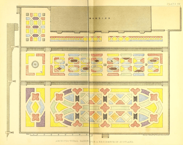 It was part of McIntosh’s modernisation of the grounds which also included planting new woodlands, moving and replanting a 500m rose trellis, and laying out twelve acres of new ornamental gardens to the north of the house which became famous for their scroll and ribbon bedding schemes.