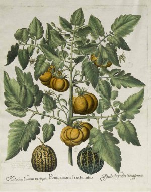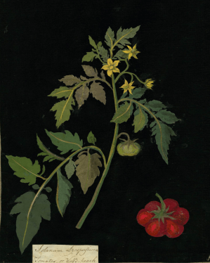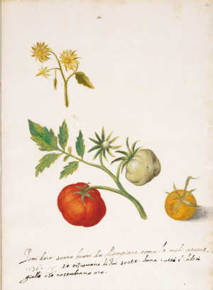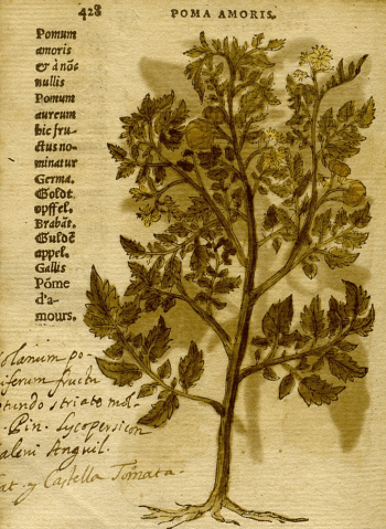 Descriptions and pictures of the tomato can also be found in practically all the manuscript and printed herbals of the second half of the sixteenth century and the first half of the seventeenth, with the first being in Pietro Andrea Matthioli’s commentary on the classical greek physician Dioscorides published in 1544. The earliest images date from the 1550s.