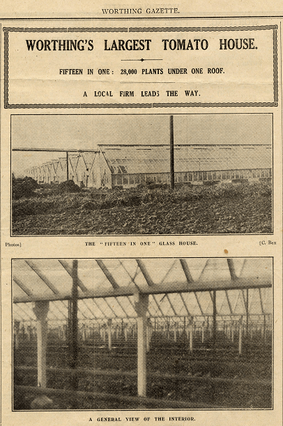 By 1899 there were about 50 acres under glass around the town, with over 100 nurserymen in business producing high-quality, highly-priced, early glass-house produce. Worthing was described in the Royal Agricultural Society Journal that year as a ‘town of hot-houses’, while in Highways and Byways of Sussex in 1904 local author E.V. Lucas added that the town “is now the centre of the tomato growing industry, with miles of glasshouses on either side”.