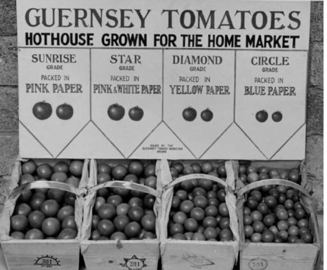 The inter-war years saw tomato growing become seriously big business in the Channel Islands, especially Guernsey. By the late 1940s tomatoes made up as much as 49% of the island’s GNP because it had about 60% of the entire UK market. This made it absolutely critical to the island’s authorities, so rather than rely on a large number of small growers working independetly, they set up the Guernsey Tomato Marketing Board in 1949 to handle all exports.